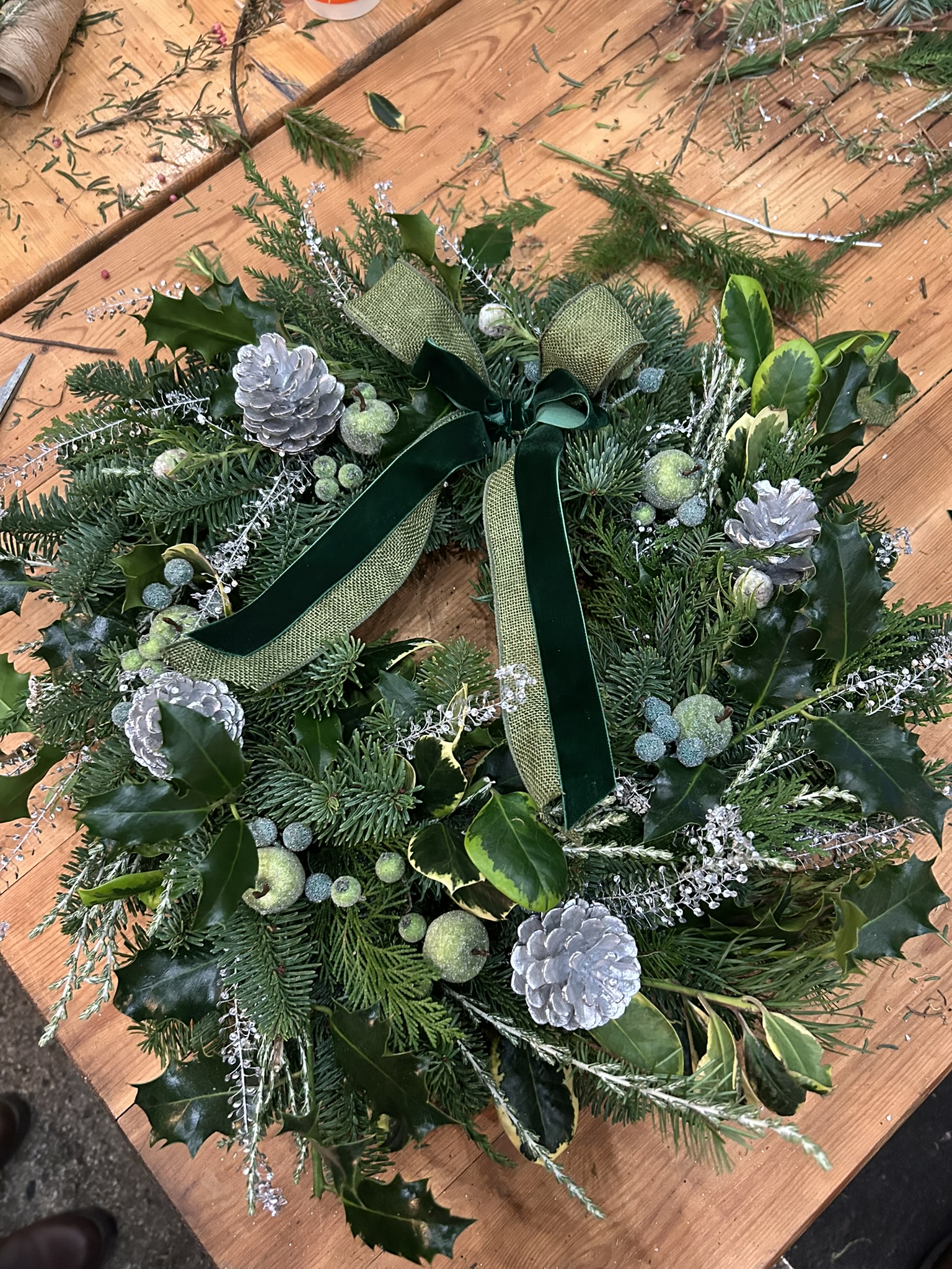 Surround yourself with festive foliage, cones, sparkle and more as you create your own wreath in your own style. We will guide you through the process, working on a moss base, with a selection of Winter foliage, you will create your own wreath in your own style, with a selection of twigs, cones, berries and more to create it in your own style.